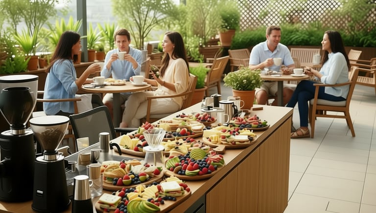 Descubre nuestro servicio de estación de café, infusiones y snacks saludables. Promovemos pausas conscientes en el horario laboral que te revitalizan y ayudan a mantener el enfoque. Disfruta de sabores únicos y opciones nutritivas que hacen de cada descanso un momento de bienestar.
